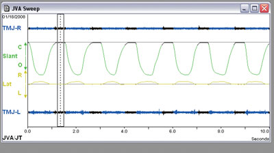 The examination continued. We used joint vibration analysis from BioRESEARCH to determine that his joints were indeed functioning within normal limits without internal derangements or degenerative joint disease.[Figure 1] In addition, computerized jaw tracking recorded his range of motion, and our clinical examination revealed no contraindication to oral appliance therapy [Figure 2]. The potential side effects of joint strain, muscle strain, and possible occlusal changes were reviewed. It was clear that Bob was eager to begin therapy, and that it was now in our hands to manage any dental or craniomandibular complication, as certainly there was much to be gained by successful therapy. After all relevant data was reviewed; together we decided to proceed with therapy. Impressions were made and a bite registration using a George Gauge was taken [Figure 3].