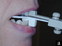 Figure 3a, 3b, 3c. The George Gauge (Great Lakes Ortho) is a valuable instrument for taking a proper bite registration for oral appliance therapy. 3a. The George Gauge is being used to help determine and record the initial degree of protrusion the dental appliance will provide. 3b. That degree of protrusion and the maxilla/mandibular relationship can be easily recorded with quick setting bite registration paste on a removable bite fork. 3c. The gauge will help determine the amount of potential protrusion, as well as the mark the amount of protrusion chosen for the initial anterior positioning of the mandible.