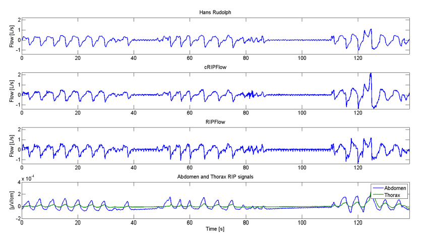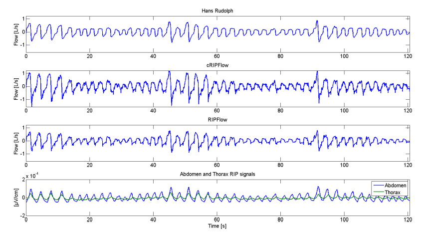 The flow measured by a Hans Rudolph pneumotach, the cRIPFlow, the RIPFlow and RIP abdomen and thorax signals during normal breathing. The total duration is 74.7 seconds. The correlation coefficient between cRIPFlow and Hans Rudolph is r = 0.994 and between RIPFlow and Hans Rudolph, r = 0.992