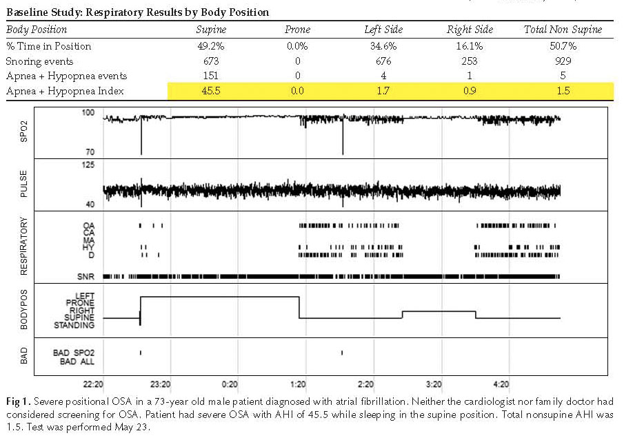 This case study illustrates the cost-effective approach to successful home sleep apnea screening. It also shows the vital importance of recording body position and how subjective reports may be qualified using objective, empirical data. Home diagnosis and monitoring of` sleep apnea is a valid tool which should be used with a suitable patient population to extend sleep medicine practice into the community. The successful outcomes associated with positional therapy are not surprising, and are consistent with a recent study which concluded “positional therapy is equivalent to CPAP at normalizing the AHI in patients with positional OSA, with similar effects on sleep quality and nocturnal oxygenation.”