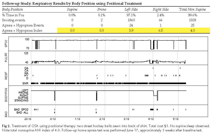 Positional therapy involved sewing two street hockey balls (cost about three dollars) into the back of a shirt. Positive feedback about treatment was received from the patient during a follow-up phone call 72-hours post baseline recording. The patient reported he was now sleeping through the night awakening at 0600 rather than during the middle of night. A subsequent home sleep apnea recording with treatment was performed approxi- mately three weeks after the baseline test. It was originally hoped that the positional treatment would reduce the RDI to a mild or moderate level, at which point therapy could be combined with oral appliance treatment (the patient was adamantly opposed to CPAP therapy). However, the results of treatment were striking in their effectiveness and are shown in Figure 2. Total recording time was six hours and 19 minutes. The supine respiratory disturbance index (RDI) dropped to 0.0 (from a baseline of 45.5) with the patient spending 0% of the night sleeping on his back. Total nonsupine RDI was 4.0 which was within normal limits. Time between 90% to 100% SpO2 was 100% of the entire night, but more importantly the number of SpO2 desaturations of ␣ 4% plummeted to one (from a baseline of 112). The patient reported better sleep, increased energy, and overall satisfaction with treatment. Additional follow-up recordings will be performed to monitor continued treatment success.