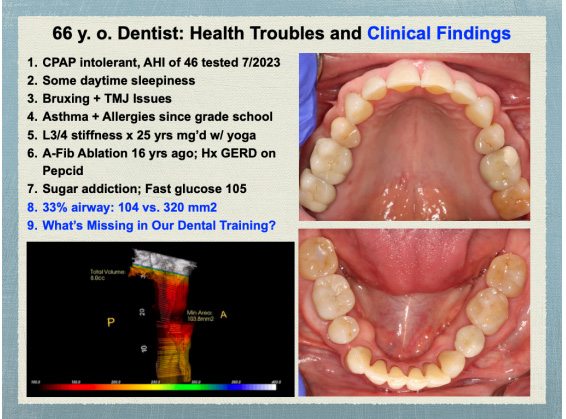 Physical evaluation reveals no caries nor periodontal inflammation. No dental crowding with 4 first bicuspid missing. Minimal airway area on his CBCT is 104 mm2, which is barely enough to survive with struggles. What would do you do for Dr. JB, based on what’ve learned from dental school, or from taking CE? How can we better serve Dr. JB, and indeed many patients in similar plight? Managing symptoms can be costly and escalating, while finding and treating root causes is effective and de-escalating. Thus treating root cause is ultimately more cost-effective and higher order patient service.