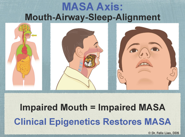 The body is organized around the Mouth-Airway-Sleep (MAS) axis from birth on. Indeed, all of Dr. JB’s symptoms at age 66 can be traced to not knowing Impaired MASA: Mouth-Airway-Sleep-Alignment (MASA) Axis in 120 dental checkups over 60 years.