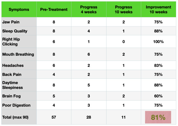 1. All symptoms improved, whether dental, medical, or cerebral (sleep quality, brain fog), which reflects on the mouth’s multiple physiological functions.