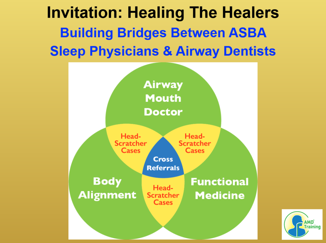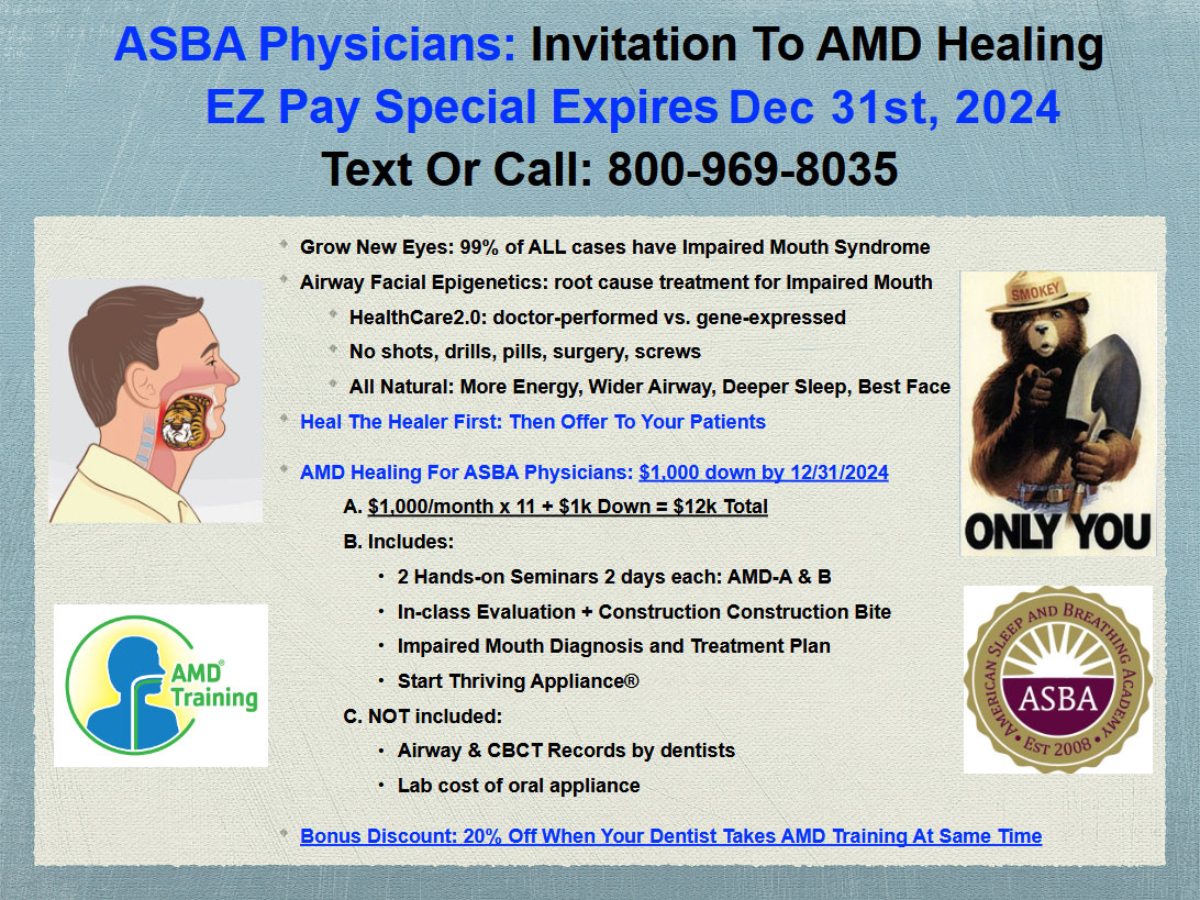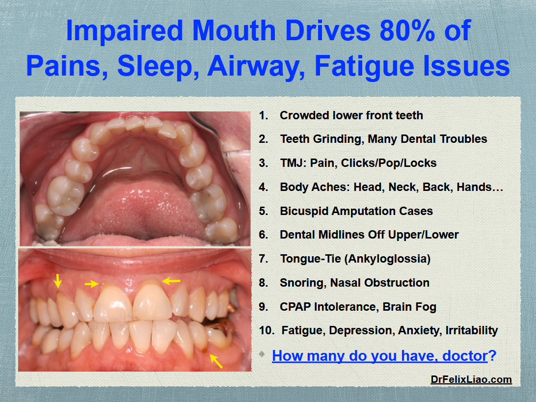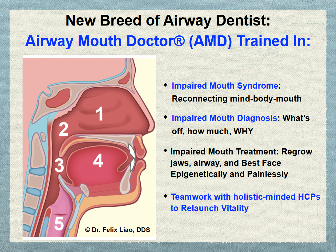 I’m delighted to share a new playbook for airway dentists and sleep physicians to join forces. 99% of all patients (their doctors included) suffer from Impaired Mouth Syndrome: oral contributions to narrow airway, chronic pain, fatigue, bruxing, TMJ, anxiety, depression, brain fog, and more. A novel Airway Facial Epigenetics method can treat Impaired Mouth as follows:.